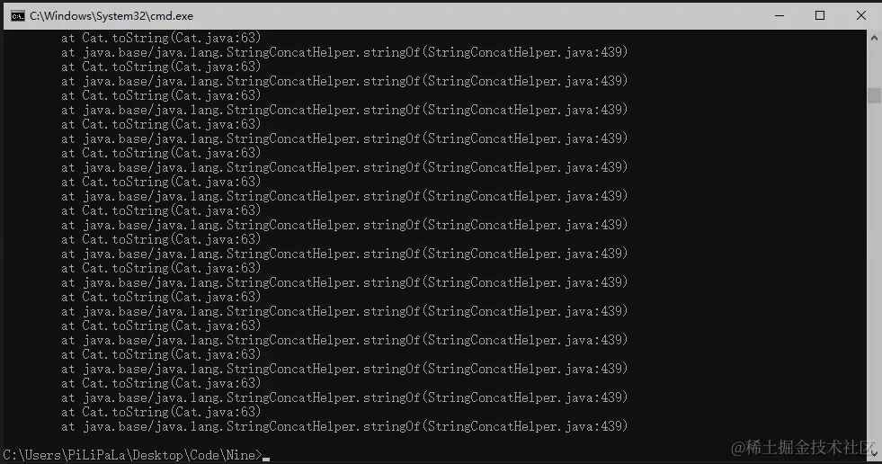 其实我们写这段代码的本意可能是在输出当前类信息的基础上在输出一个当前实例类名加哈希码(类似这种,Demo@304e94a4)但是因为我们重写了toString方法,然后我们在toString时还对本身的对象进行了输出,就导致this会继续执行toString方法。