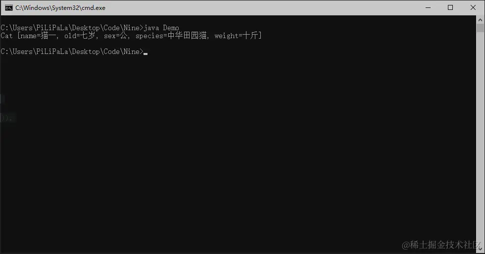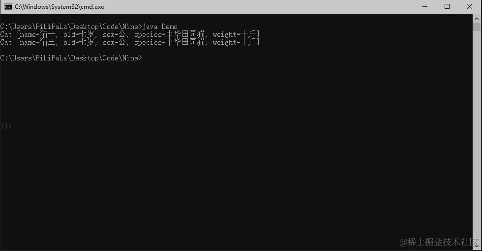 细心的小伙伴可能发现了我们在输出时的代码不一样一个是catOne.toString()一个是catTwo但是输出并没有出现什么问题,这是因为Java在直接输出对象时会调用toString()方法。