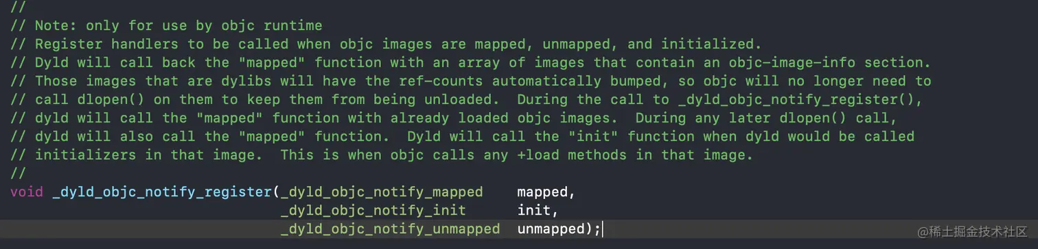 objc把回调函数map_images、load_images、unmap_image分别传给了dyld的sNotifyObjCMapped、sNotifyObjCInit、sNotifyObjCUnmapped