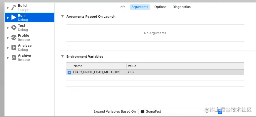 Product->Scheme->Edit Scheme, 以OBJC_PRINT_LOAD_METHODS为例设置成YES,打印所有实现了load方法的类2、通过终端命令