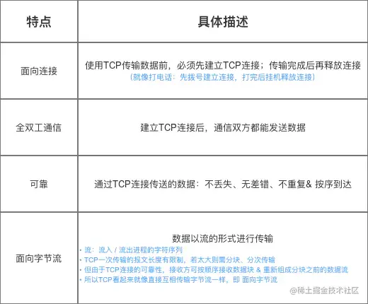 - 面向连接、面向字节流、全双工通信、可靠