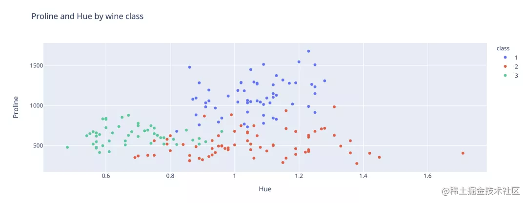 将class添加到我们刚才创建的散点图中。通过Plotly可以轻松地为每个类应用不同的颜色,以便直观地看到分类。