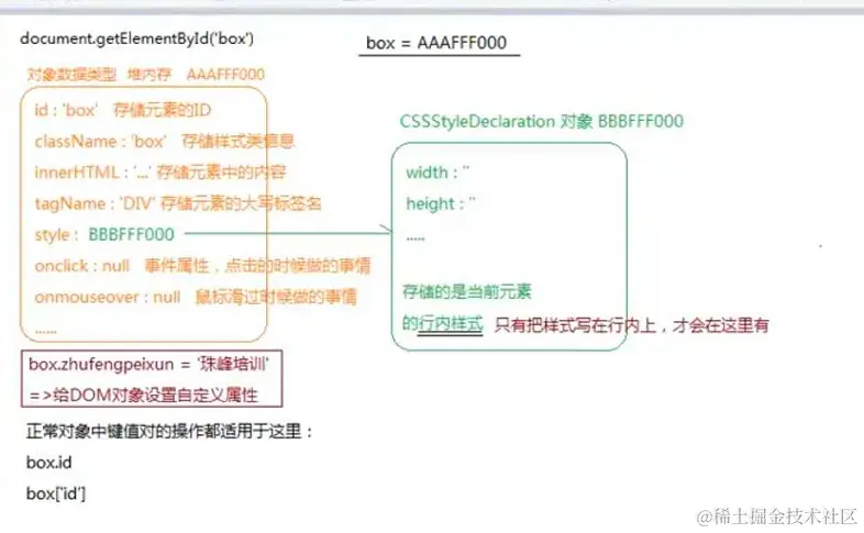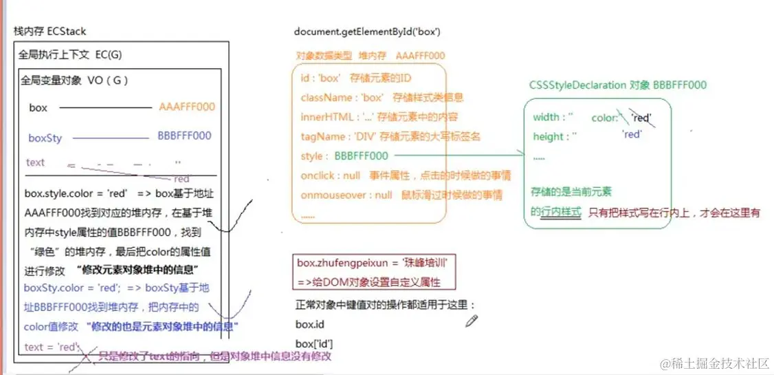 <!DOCTYPE html><html lang="en"> <head> <meta charset="UTF-8" /> <meta name="viewport" content="width=device-width, initial-scale=1.0" /> <meta http-equiv="X-UA-Compatible" content="ie=edge" /> <title>DOM</title> </head> <body> <div class="box" id="box"> <h2>前端学习清单</h2> <ul> <li>HTML5+CSS3</li> <li> JavaScript(Es6)基础知识、核心知识、项目实战、组件封装、设计模式等 </li> <li>AJAX和HTTP</li> <li>Vue/React/小程序开发的全家桶(基础、源码、实战)</li> <li>Webpack/Node/Git等常用的工具类或者全栈化</li> </ul> </div> <script> let box = document.getElementById('box'); box.style.color = 'red'; let boxSty = box.style; // => 获取的是style对应的对象 BBBFFF000 boxSty.color = 'red'; let text = box.style.color; // => 获取的是color初始值'',基本类型值,直接存储再栈内存中 text = 'red'; </script> </body></html>