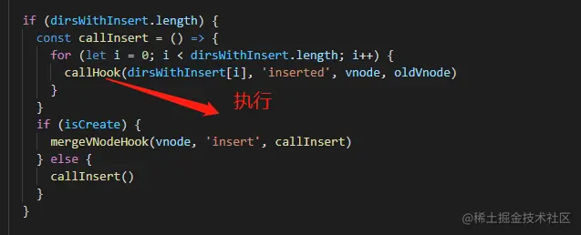 - 遍历收集到的dirsWithInsert指令集合,并执行对应的inserted钩子函数;