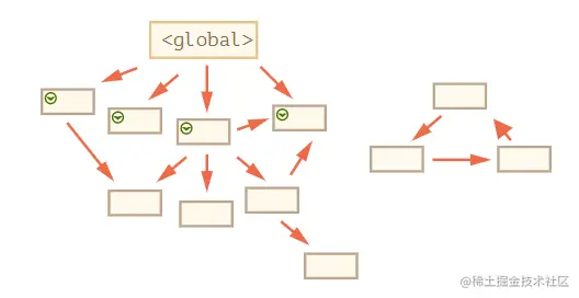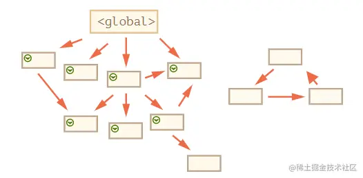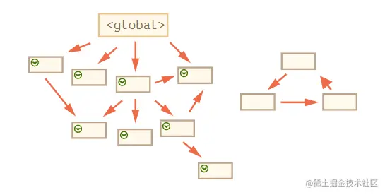 我们可以清楚地看到右侧有一个“无法到达的岛屿”。现在我们来看看“标记和清除”垃圾收集器如何处理它。