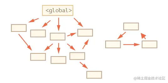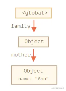 比方说,如果全局变量中有一个对象,并且该对象有一个属性引用了另一个对象,则该对象被认为是可达的。而且它引用的内容也是可达的。下面是详细的例子。