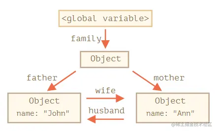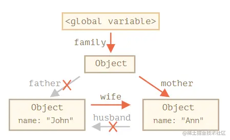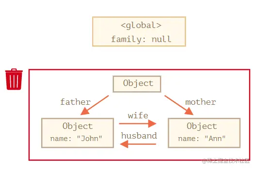 前面说的 "family" 对象已经不再与根相连,没有了外部对其的引用,所以它变成了一座“孤岛”,并且将被从内存中删除。