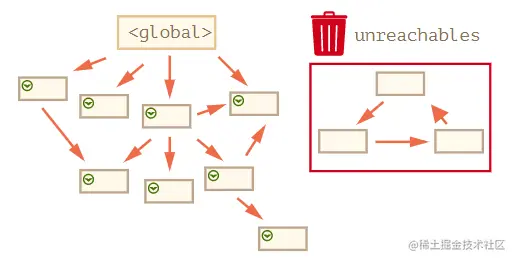 - 被引用与可访问(从一个根)不同:一组相互连接的对象可能整体都不可达。 现代引擎实现了垃圾回收的高级算法。