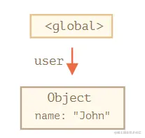 这里的箭头描述了一个对象引用。全局变量 "user" 引用了对象 {name:"John"}(为简洁起见,我们称它为 John)。John 的 "name" 属性存储一个原始值,所以它被写在对象内部。