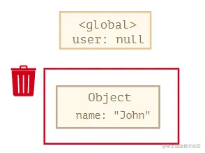 对外引用不重要,只有传入引用才可以使对象可达。所以,John 现在是不可达的,并且将被从内存中删除,同时 John 的所有数据也将变得不可达。
