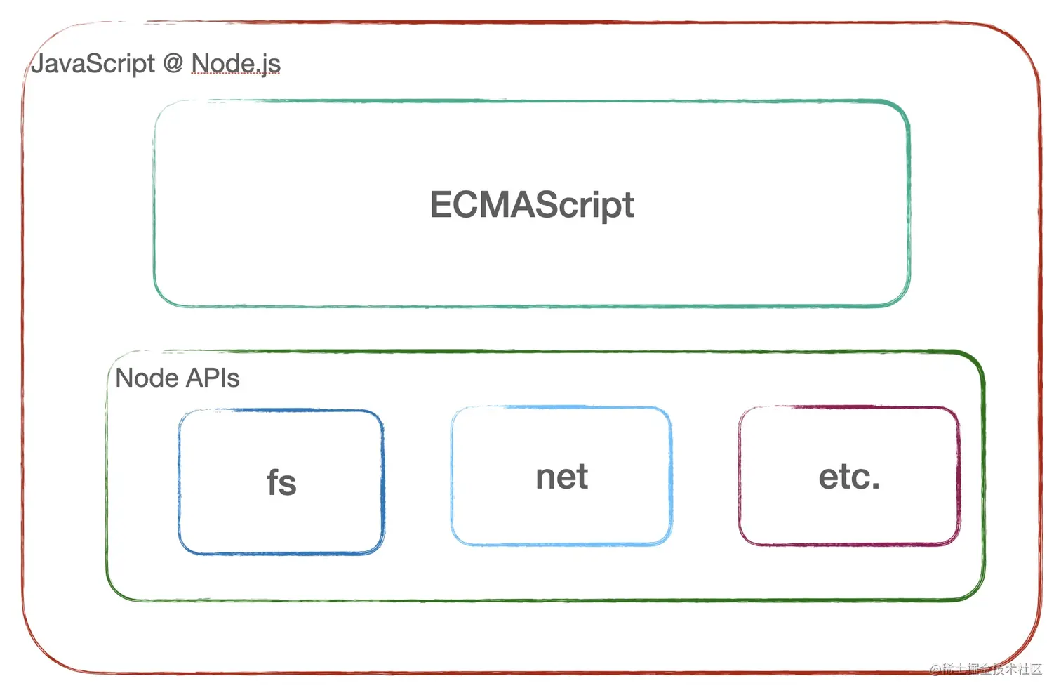 总的来说,浏览器环境中 JavaScript等于ECMAScript + Web提供的API,Node环境中Javascript等于ECMAScript + Node提供的API(fs,net模块等)。