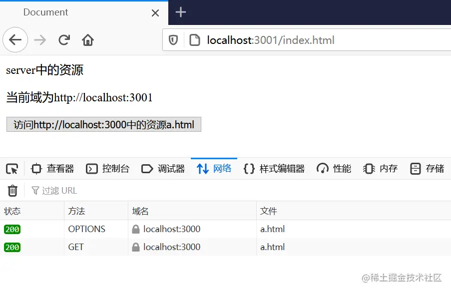 (在谷歌浏览器中可能是因为某些默认的浏览器设置,导致看不到options请求,截图中的结果是在火狐浏览器中查看的)