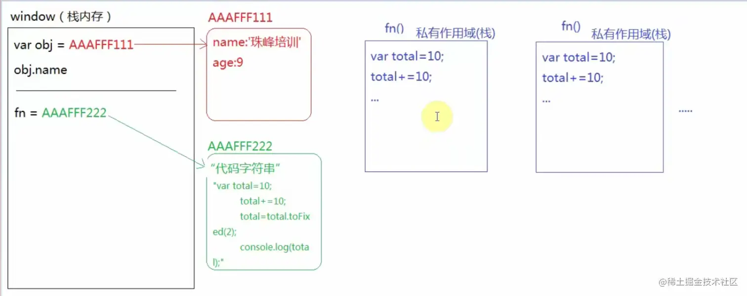 1、函数也是引用类型,首先会开辟一个新的堆内存,把函数体中的代码当做“字符串”存储到内存中(对象向内存