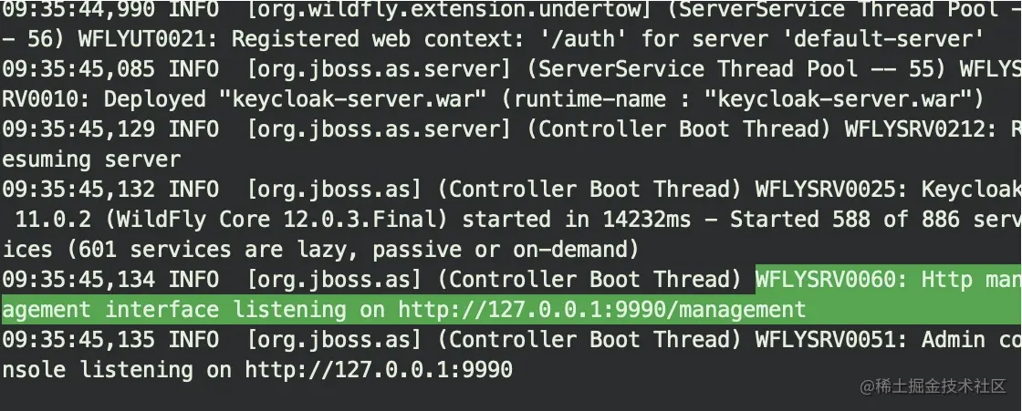 执行bin目录下的./standalone.sh文件,即可启动keycloak server。可以看到它监听在9990端口。