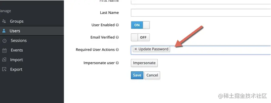 注意,这里有一个小小的细节。如果我们更新了用户的密码。在用户设置的主页面,将会出现update Password字样。它的意思是,需要用户进行一次自己的密码更新,这个用户才能真正使用。如果你不需要强制用户设置一遍密码,就可以把它删掉。