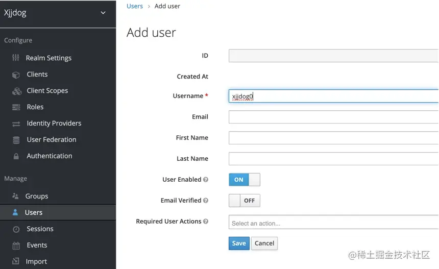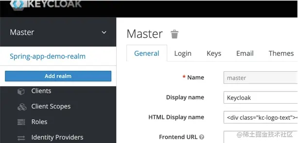 要想使用Keycloak,需要先生成一个Realm。Realm是领域的意思,在它其中,所有的用户和权限都是独立的。如果这些公司愿意的话,我可以把京东和淘宝的用户全部放在一个server上。