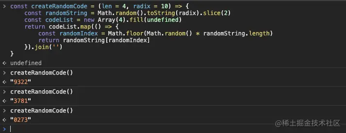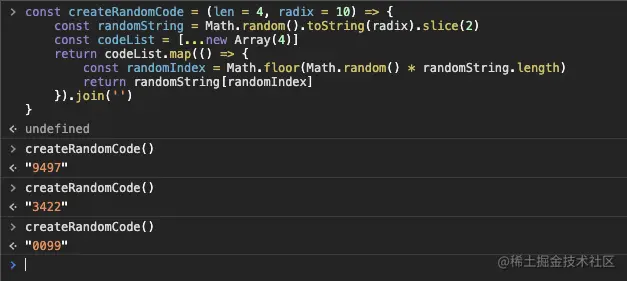 从返回值可以倒推出问题在 const codeList = new Array(4) 上。我们希·望通过 new Array(len) 方法生成一个长度为 len 的数组。但实际生成的仅仅只包含一个 length 属性而已,实际数组中并没有任何值。因此在使用 map 的时候没有元素可以遍历。