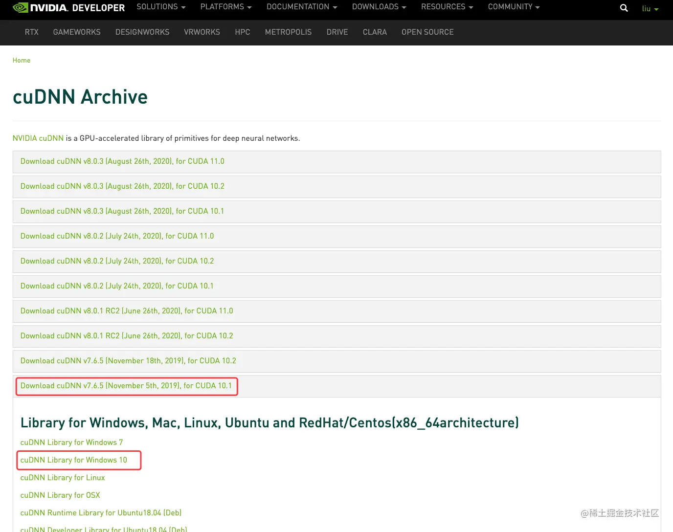 cuDNN 是一个 GPU 加速的深度神经网络库,下载 cuDNN SDK 需要注册 NVIDIA Developer Program,进入下载页面后选择 CUDA 10.1 的 cuDNN 7.6 版本。