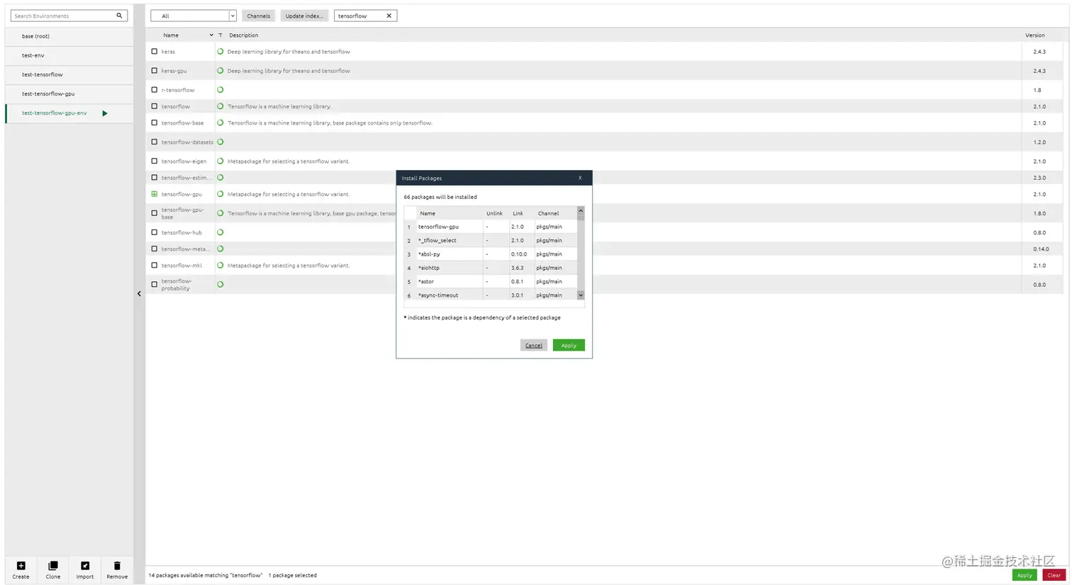 使用 conda 安装 tensorflow-gpu,在输入栏输入 tensorflow 选择 tensorflow-gpu 点击 Apply 即可。