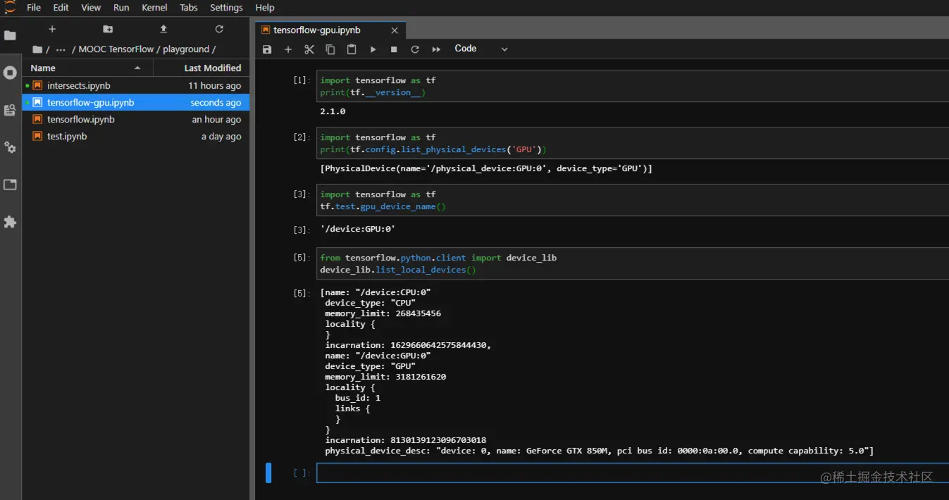 打印出来了可用于计算的设备有 CPU 与GPU,并分别打印出它们的信息及 GPU 计算能力,安装成功之后,接下来就可以跑代码训练神经元网络了。