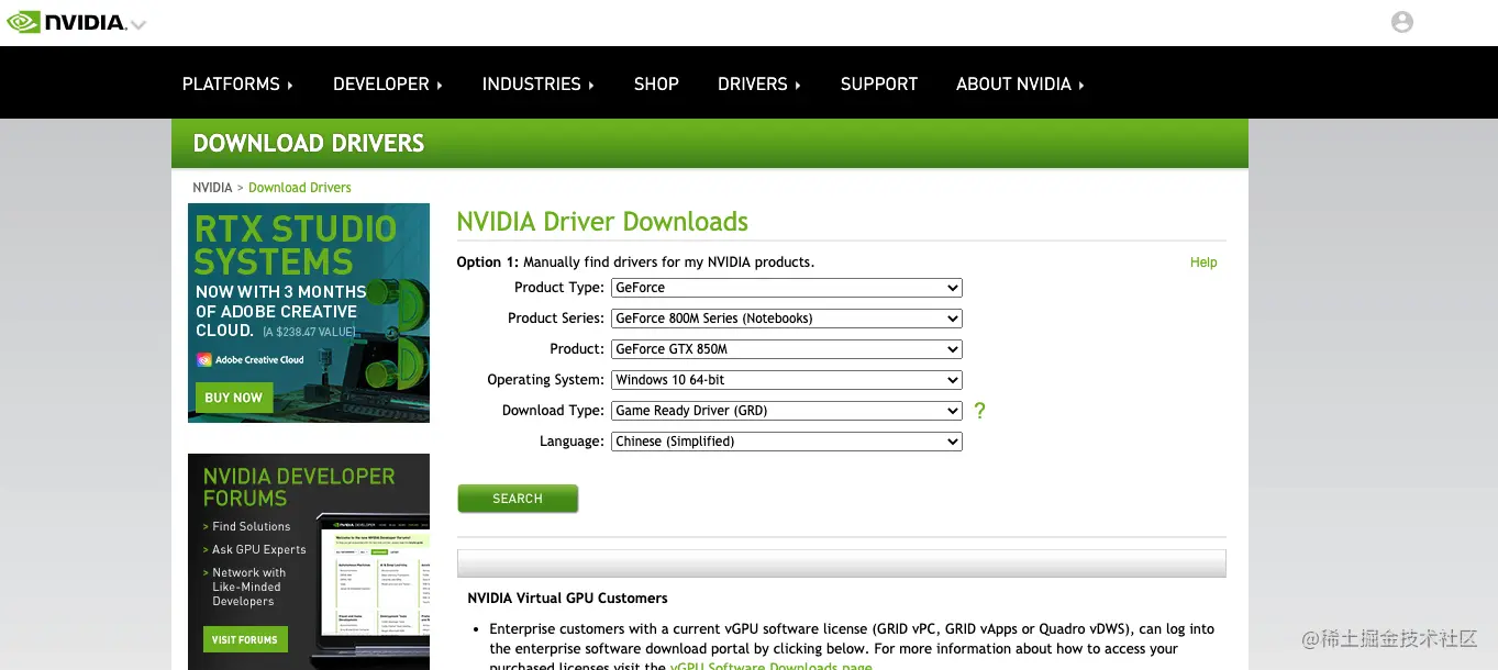 输入信息查询显卡驱动,下载安装最新的 NVIDIA® GPU 驱动程序,方便后面支持 CUDA Toolkit 安装 10.1 版本,CUDA Toolkit 10.1 需要驱动版本 418.x 或更高版本。