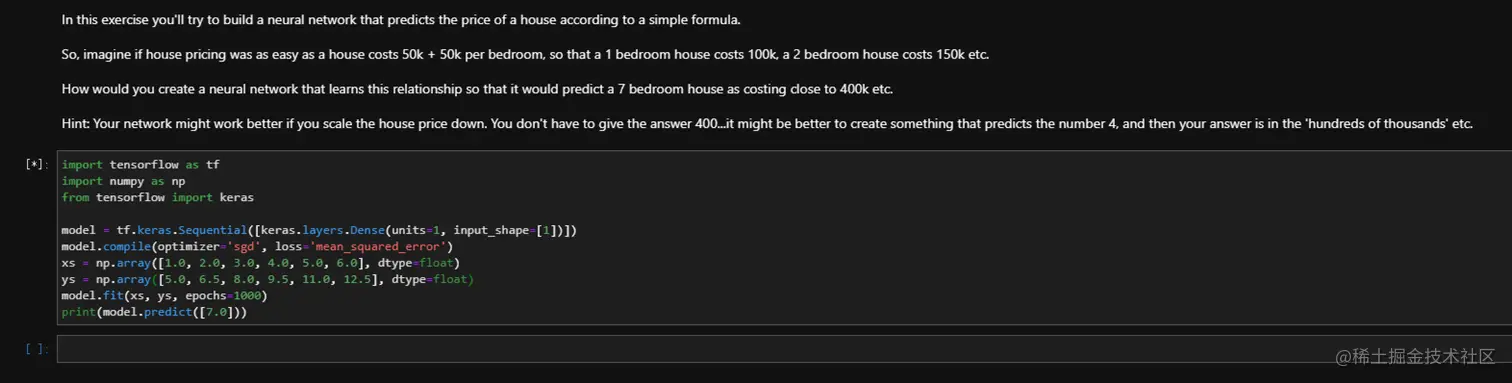 最后来跑一跑常见的一个入门 Hellow World DEMO,根据一个简单的公式和构建一个神经网络,简单预测房屋的价格。