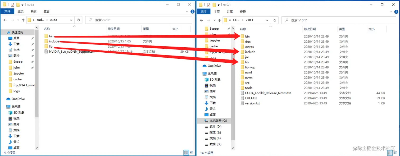 下载成功之后将其压缩包解压,拷贝放到 CUDA 目录 C:\Program Files\NVIDIA GPU Computing Toolkit\CUDA\v10.1\下面,这里拷贝是指将这三个目录下面的文件拷贝放入到 CUDA v10.1 对应的目录里面。