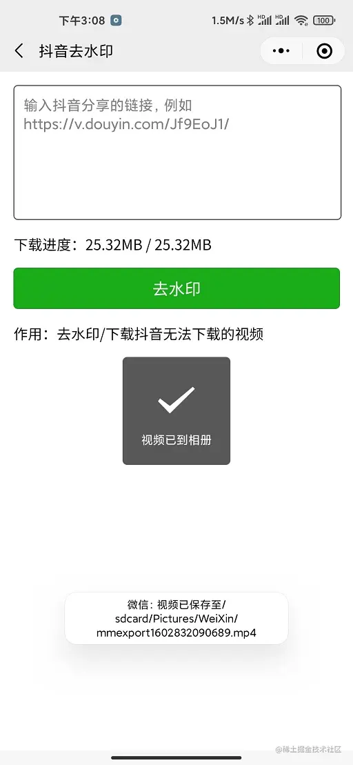 通过上面 3 个步骤,就可以做出下载抖音无水印的小程序。
