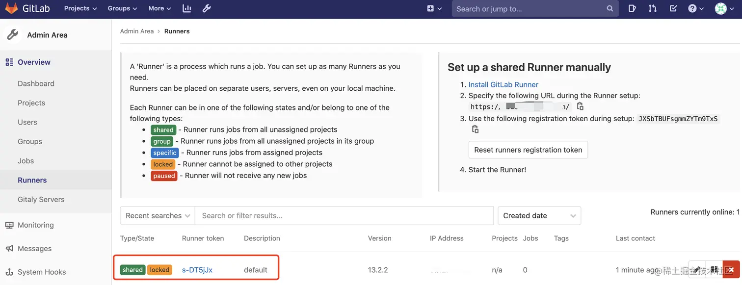 查看GitLab Runner,如下图,共享型Runner(所有项目都可以使用)注册成功