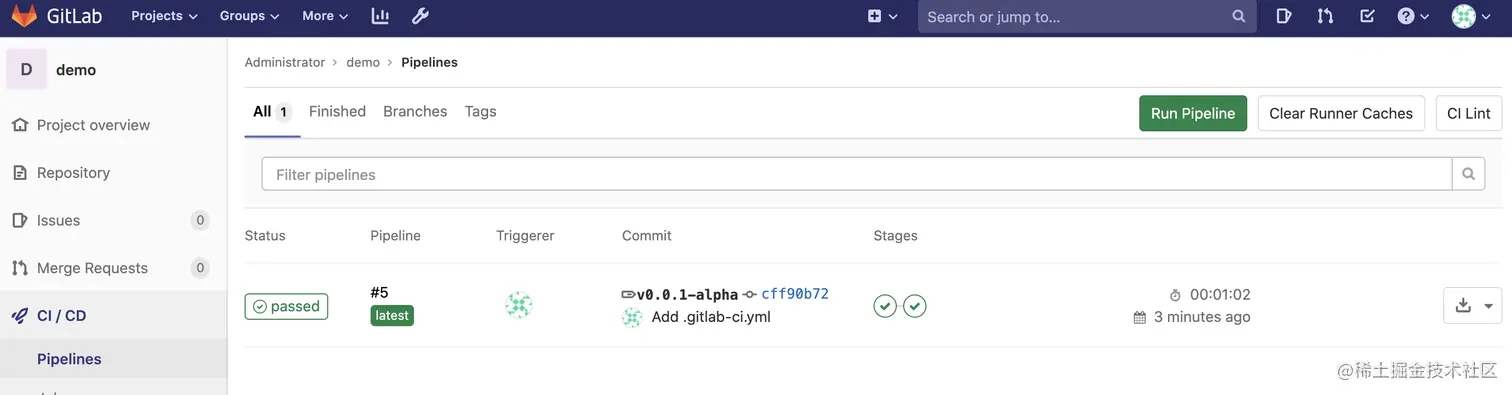 .gitlab-ci.yml文件,具体写法见官方文档variables: COMPILE_IMAGE: node:12.14.0-alpine ANSIBLE_IMAGE: ansible/centos7-ansible cache: key: "$CI_PROJECT_NAMESPACE" paths: - node_modules stages: - build - deploy build_alpha: only: - /^v\d+\.\d+\.\d+-alpha$/ stage: build image: $COMPILE_IMAGE artifacts: name: "${CI_COMMIT_TAG}" paths: - dist/ script: - npm config set registry https://registry.npm.taobao.org/ - npm config set sass_binary_site https://npm.taobao.org/mirrors/node-sass/ - npm install - npm run build allow_failure: false deploy_alpha: only: - /^v\d+\.\d+\.\d+-alpha$/ stage: deploy image: $ANSIBLE_IMAGE variables: GIT_STRATEGY: none script: - mkdir ~/.ssh/ - echo -e "${SSH_PRIVATE_KEY}" > ~/.ssh/id_rsa - chmod 600 ~/.ssh/id_rsa - export ANSIBLE_HOST_KEY_CHECKING=False - echo -e "${ANSIBLE_HOSTS}" > ~/hosts - echo -e "${ANSIBLE_PLAYBOOK}" > ~/playbook.yml - cd ./dist - tar zcf ../dist.tar.gz * - ansible-playbook ~/playbook.yml -i ~/hosts --extra-vars "{'server_name':'alpha_server'}" allow_failure: false通过打Tag触发CI pipeline,Runner负责执行.gitlab-ci.yml定义的任务,打包代码并部署到服务器,部署代码这里使用了Ansible
