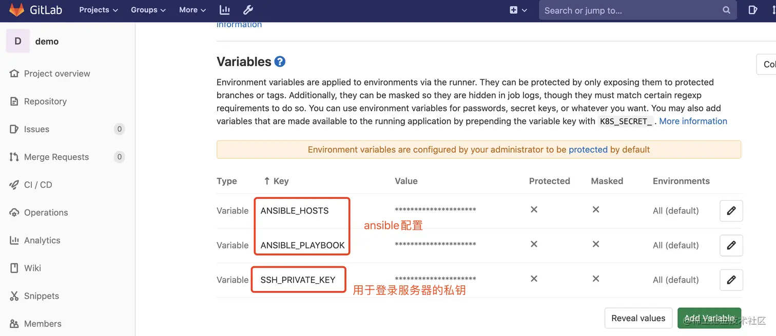 .gitlab-ci.yml文件。这里使用 Ansible 进行部署,由于部署每个项目所执行的操作基本上都是不一样的,也就意味着配置需要跟着项目走,所以把Ansible的配置写进项目变量里,这里根据你们实际需求去配置 -