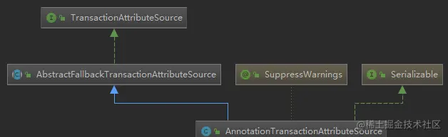 AnnotationTransactionAttributeSource类的作用就是封装事务注解@Transactional的属性,这里需要记住其继承体系以及熟悉该类和其父类的属性和方法,对后面分析事物切面执行原理有帮助: