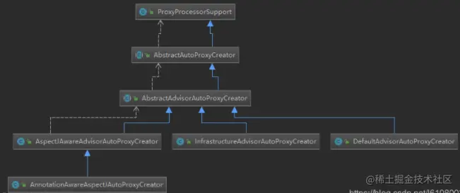 可以看到,InfrastructureAdvisorAutoProxyCreator是优先级最低的,基本上不会起作用;AspectJAwareAdvisorAutoProxyCreator是当我们配置了aop:config标签时会注册,也就是xml配置的AOP的入口类;而AnnotationAwareAspectJAutoProxyCreator是当我们配置了aop:aspectj-autoproxy或使用@EnableAspectJAutoProxy注解时注册,因此大部分情况下都是使用的AnnotationAwareAspectJAutoProxyCreator。