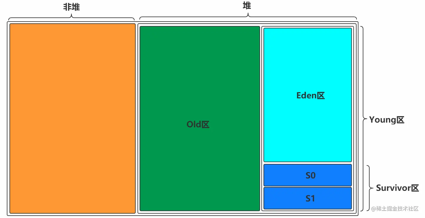 如下图逻辑上的堆分为非堆(方法区)堆。