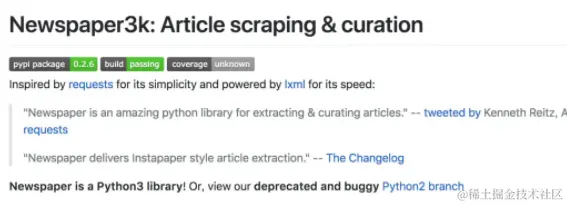 Newspaper可以用来提取新闻、文章和内容分析。使用多线程,支持10多种语言等。
