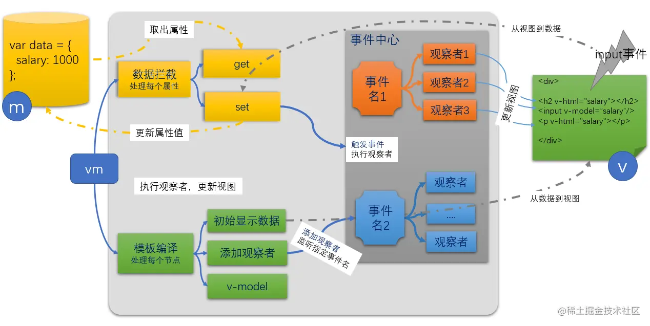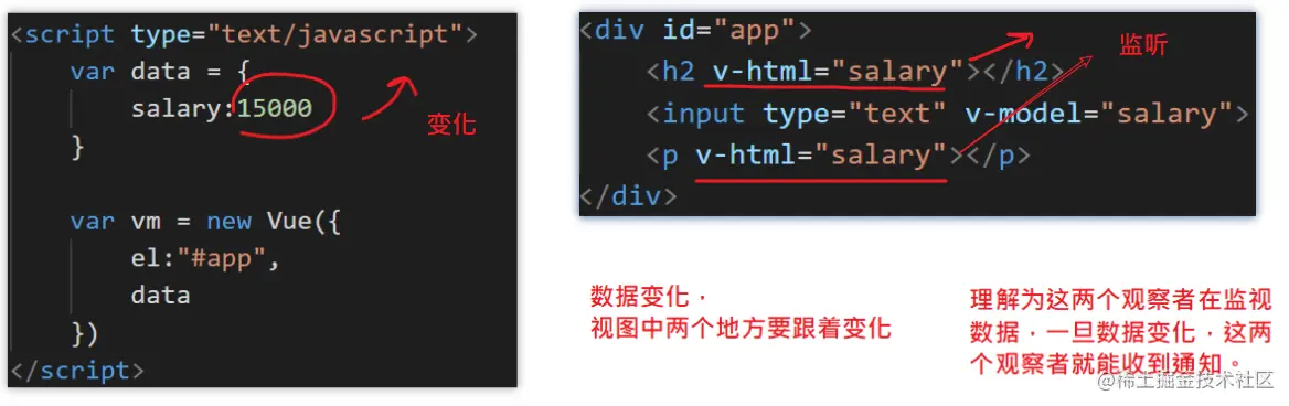 用户在视图上的修改也应该反映在数据上。也就是说,当input框中的内容变化时,vm.salary的值也要变化,同时两处对应的v-html的内容也要变化,