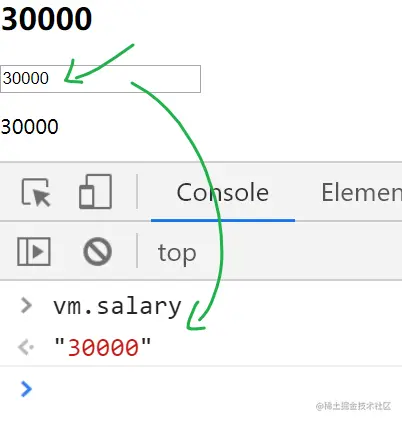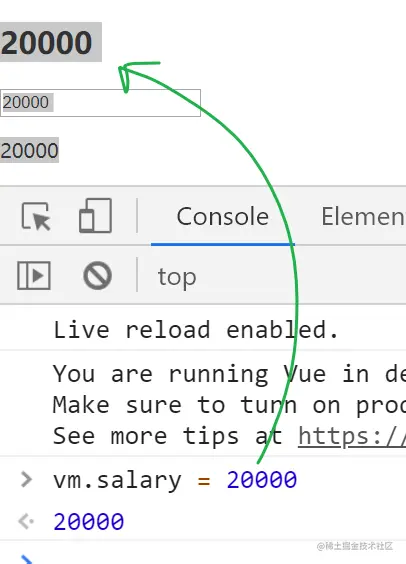 在控制台中直接修改vm.salary值来观察视图上的变化。