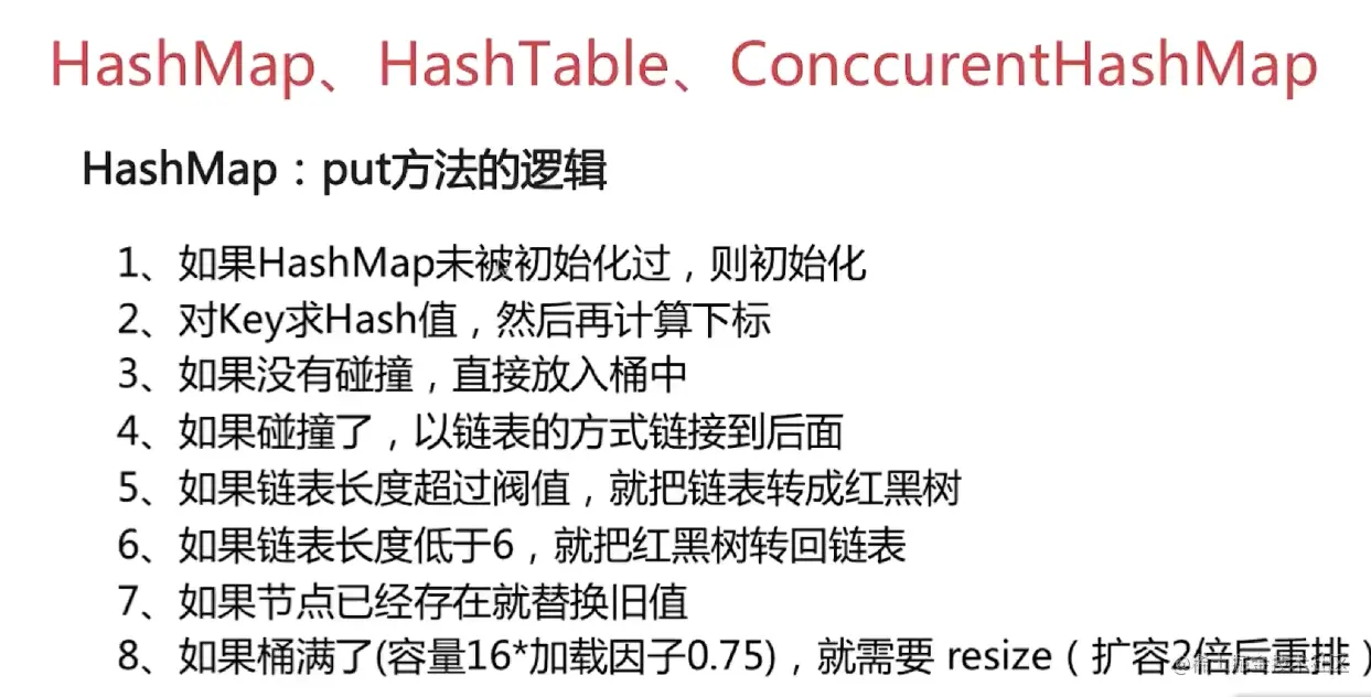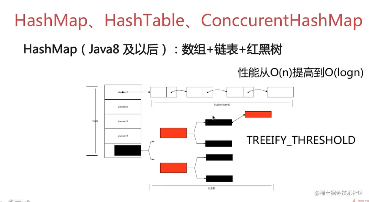java8后,使用到了红黑树,性能大大提高,当桶值超过8后,会变成红黑树,否则是链表