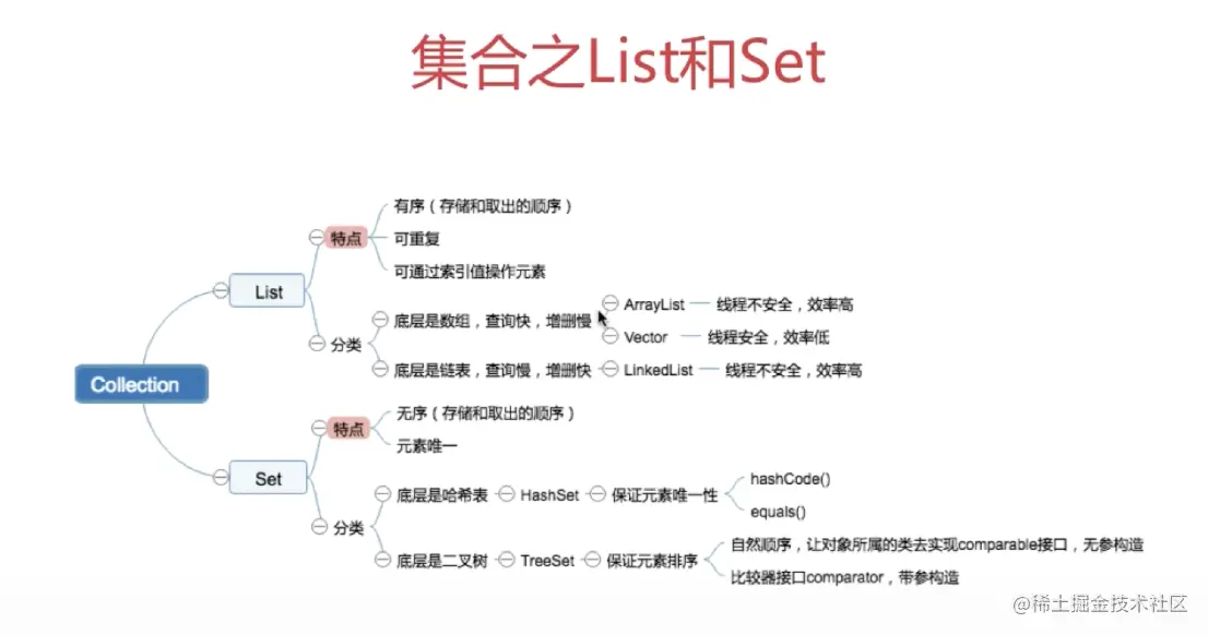集合考点: 集合的总结:集合包含有set,map,list特征:set是值不可重复的,map是以k-v的方式存储,再java8以前,是使用数组和链接的结合去实现map,java8以后,是链表+数组+红黑树的存储; set:HashSet/TreeSet HashSet:内部的数据结构是哈希表,是线程不安全的。他是通过hashcode方法和equal方法去保证数据的不重复 TreeSet:可以对Set集合中的元素进行排序,是线程不安全的。 元素自身具备比较功能,即自然排序,需要实现Comparable接口,并覆盖其compareTo方法。 元素自身不具备比较功能,则需要实现Comparator接口,并覆盖其compare方法。 list:vector、linklist、arrarylist map:hashmap是是链表+数组+红黑树的存储;如果大于8,就转换为红黑树,低于6转换为链表 treemap是红黑树的存储结构