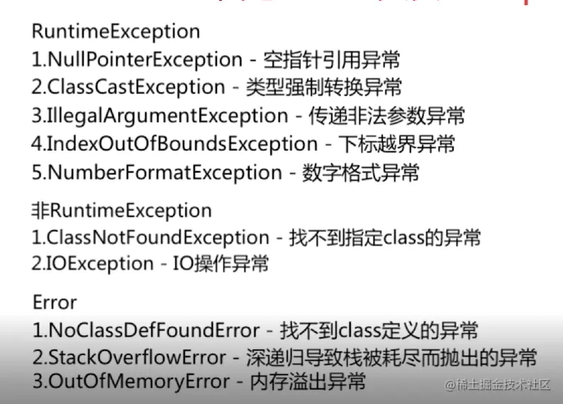 非运行时异常:是RuntimeException以外的异常,类型上都属于Exception类及其子类。从程序语法角度讲是必须进行处理的异常,如果不处理,程序就不能编译通过。如: IOException、文件读写异常 FileNotFoundException:文件未找到异常 EOFException:读写文件尾异常 MalformedURLException:URL格式错误异常 SocketException:Socket异常 SQLException:SQL数据库异常