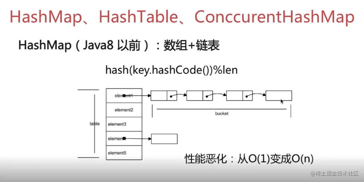 java8前,该结构,如果元素都是再同一个hash值上,那么性能就大大减低
