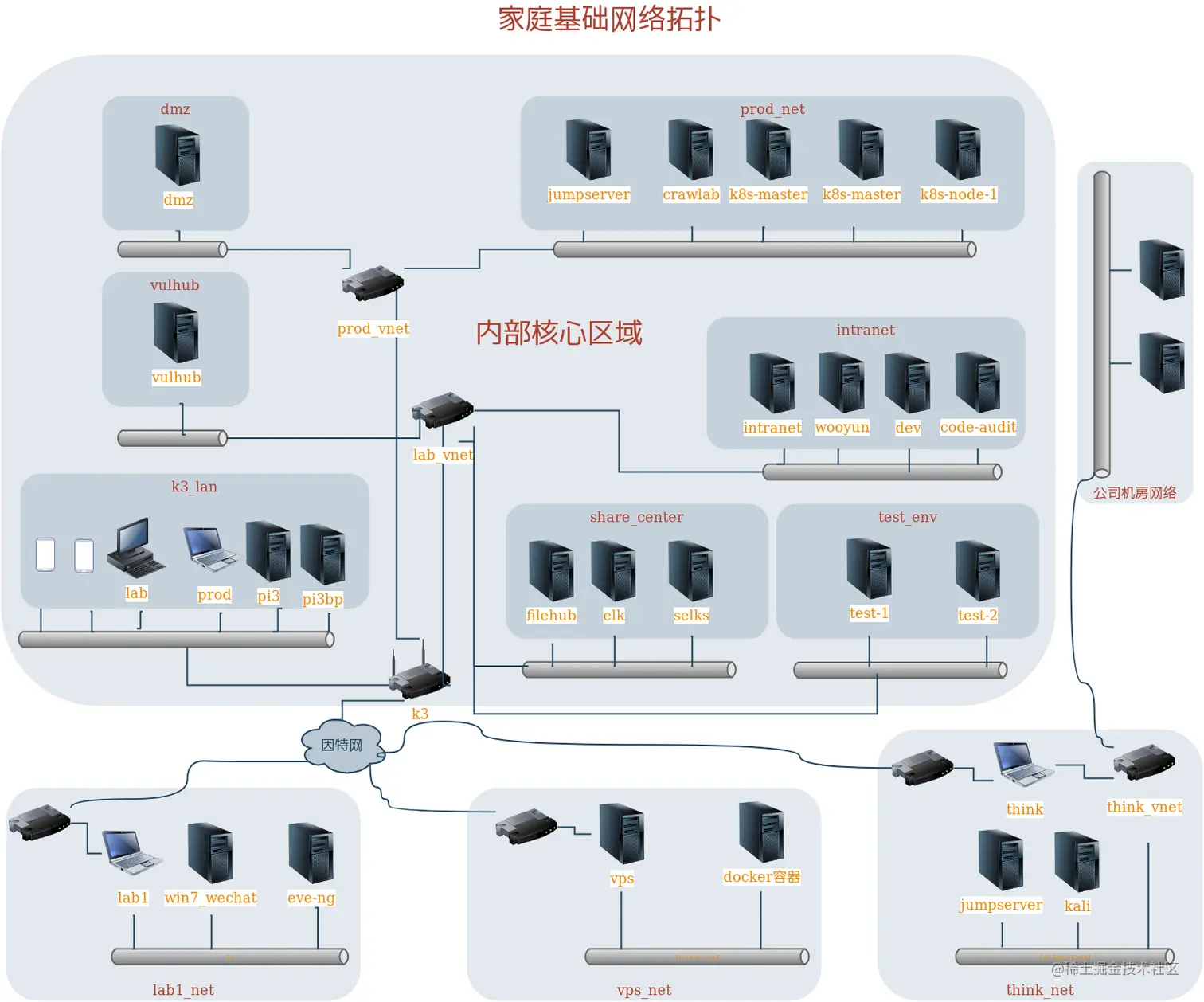 基础组网 通过 OpenVPN 连接异地主机,为便于审计,整个内网主要采取路由转发方式,只在外网出口、和工作机接入处做源地址转换,OpenVPN 客户端所在子网则通过 OpenVPN 自带的 iroute 技术进行逆向路由数据包。Dnsmasq 用作内部核心 DNS 解析服务器。网络主要分家庭网和工作网,家庭网与工作网没有直接打通,而是需要先登录工作机上的跳板机方可进一步操作工作网资产,出于规避将家庭网中的风险引渡到工作网络的风险。