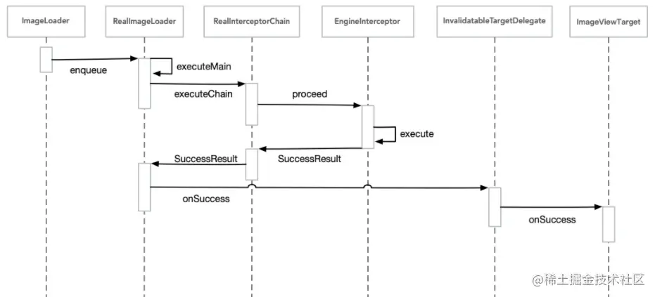 从ImageLoader的enqueue方法开始,进入到RealImageLoader,然后是一个责任链,最终执行到Engine拦截器,内部主要是获取ImageRequest设置的图片路径,然后通过mappers转化为特定的类型以提供给fetchers处理,主要流程如下图所示,其中mapper、fetcher、decode都可以通过ComponeRegisty设置自定义效果