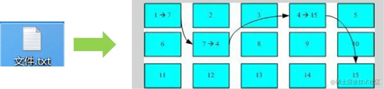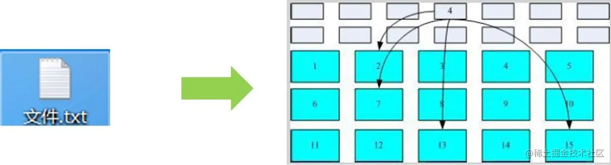 假设每个块为1KB,一份4KB大小的文件,被分为4个文件块,分别存储到块1、4、7、15中去。
