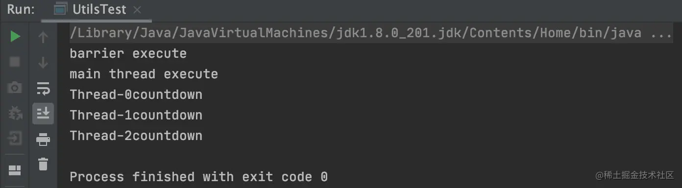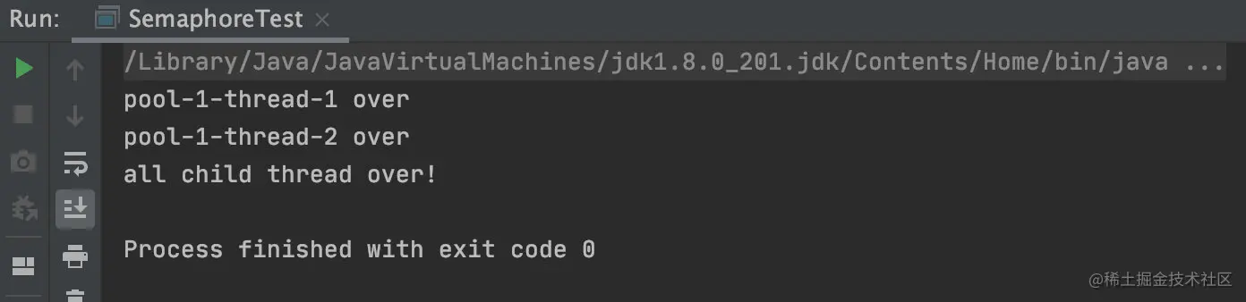 上面的案例代码首先创建了一个信号量实例,构造函数的入参为0,说明当前信号量计数器的值为0,然后main函数向线程池添加了两个线程任务,在每个线程内部调用信号量的release方法,这相当于让计数器的值增1。最后在main线程里面调用信号量的acquire防范,传参为2说明调用acquire方法的线程会一直阻塞,直到信号量的计数变为2才会返回。看到这里大家应该明白了吧,如果构造Semaphore时传递的参数为N,并在M个线程中调用了该信号量的release方法,那么在调用acquire使M个线程同步时传递的参数应该是M+N.