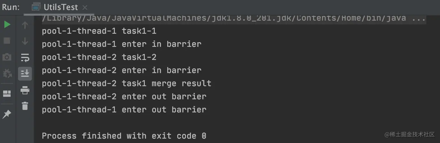 如上代码创建了一个CyclicBarrier对象,其第一个参数为计数器初始值,第二个参数Runable是当计数值为0时要执行的任务。在main函数里面先创建了一个大小为2的线程池,然后添加两个子任务到线程池中,每个字线程在执行完自己的逻辑后会调用await方法。一开始计数值为2,当第一个线程调用方法时,计数器值递减为1。由于此时的计数器值不为0,所以当前线程就到了屏障点而被阻塞。然后第二个线程调用await时,会进入屏障,计数器值也会递减,现在计数器值就为0了,这时就会去执行CyclicBarrier构造函数中的任务,执行完毕后退出屏障点,并且唤醒被阻塞的第二个线程,这时候第一个线程也会退出屏障点继续向下执行。所以输出结果如下: