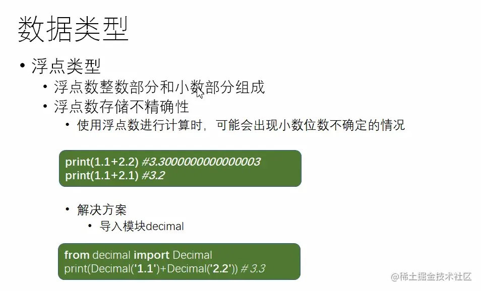 进制:由于计算机是二进制的,则浮点类型里面的:1.1+2.2=3.3000000000003(这是错误的)