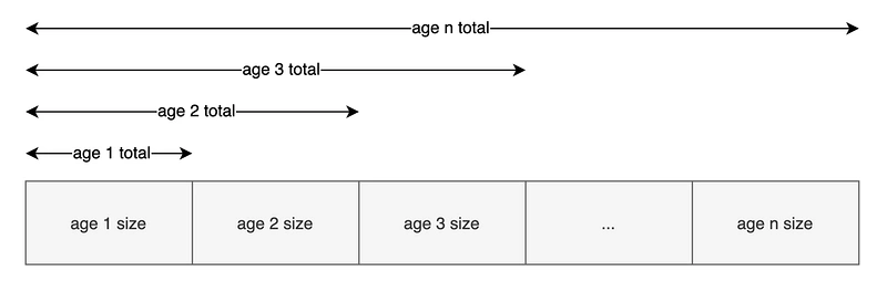 315529928 total这个是一个累加值,表示小于等于当前分组年龄的对象总大小。先把对象按年龄分组,age 1的分组total为age 1总大小(前面的xxx bytes),age 2的分组total为age 1 + age 2总大小,age n的分组total为age 1 + age 2 + ... +age n的总大小,累加规则如下图所示