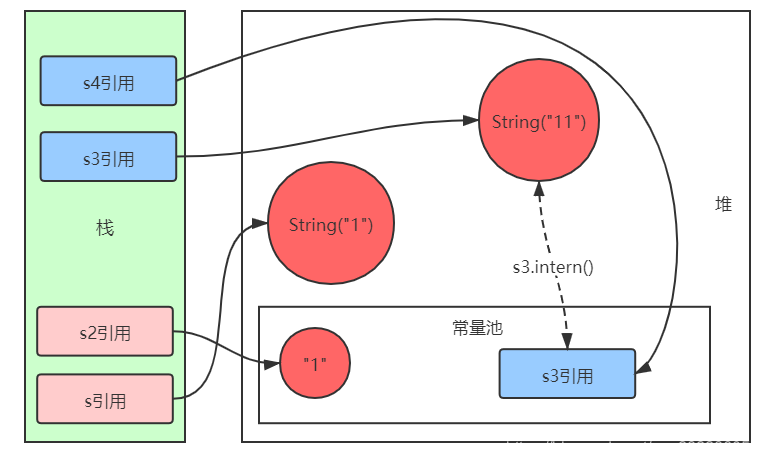 public static void main(String[] args) { String s = new String("1"); //创建了两个对象,一个堆中的“1”,一个常量池中的“1” s.intern(); //没有作用,因为常量池中有"1"了 String s2 = "1"; System.out.println(s==s2);// jdk6 false jdk8 false String s3 = new String("1")+new String("1");//虽然创建了6个对象,但常量池中没有“11” s3.intern();//对于1.8来说,直接复制引用到常量池。对于1.6则是创建了一个新对象 String s4 = "11"; System.out.println(s3==s4);// jdk6 false jdk8 true } -