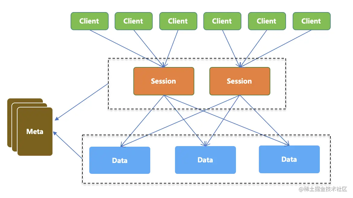 - MetaServer 维护了DataServer和SessionServer的列表。在节点变化时通知其他节点。MetaServer集群通过raft进行主从选举和数据复制。